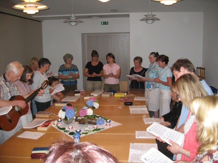Mittlerweile gibt es wieder eine Neuerung: Auf Wunsch einiger Mitglieder beginnen wir schon um halb sieben mit dem Rosenkranz. Dann erst geht der Bibel- und Gesprächsteil los. Und danach gehen wir in die Kapelle zum Gebet: Anrufung des Heiligen Geistes, Dank, Bitte, Lobpreis und Anbetung. Letztere nimmt 1/4 bis 1/3 der Zeit ein, und wir versuchen dabei in eine Haltung des hörenden Herzens zu kommen. Anfangs fiel das schwer. Allmählich aber lernen wir immer mehr das Geschenk der Ruhe vor Gott und des inneren Friedens anzunehmen. Und ein anderes Geschenk bemerken wir vor allem nachher, wenn die Leute oft ganz erfüllt sind und gar nicht heimgehen wollen: die Freude.