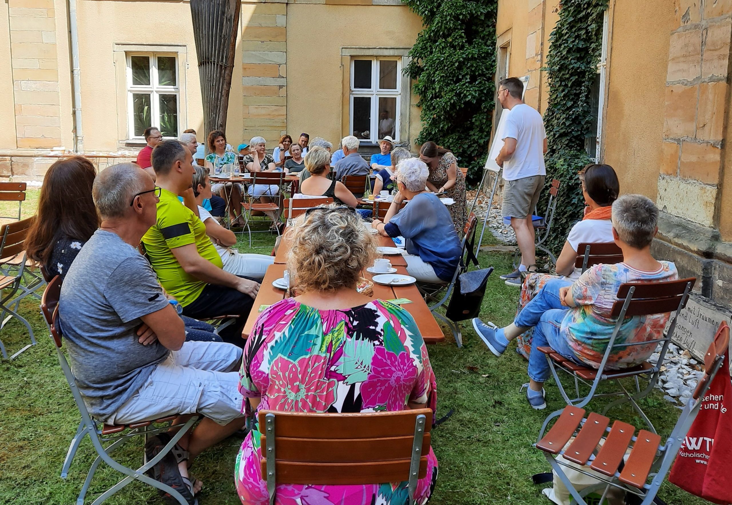 Der Innenhof im Bildungshaus Kloster Ensdorf mit seinen Schattenplätzchen hat sich auch in diesem Jahr als optimaler Ort zum Versammeln und Feiern erwiesen. Trotz vieler Terminüberschneidungen und teilweise großer Entfernungen sind am 24. Juli an die 35 Personen der Einladung unseres Vorsitzenden Jörg Oppitz bzw. unseres Vorstands zur Mitgliederversammlung incl. Sommerfest gefolgt. Der versiert und humorvoll vorgetragene Rechenschaftsbericht Jörg Oppitz‘ und unserer Kassierin Sieglinde Vogel wurde, bei Kaffee und Kuchen vorgetragen, zu einer netten Unterhaltung, der man gerne lauschte und über die man manchmal staunte. Viel war geboten im E-Werk, auch im letzten Jahr, trotz aller Einschränkungen. Nach Entlastung des Vorstands leitete unser Ehrenvorsitzende Werner Spitzl in gewohnt gekonnter Weise die Wahlen, die für manche Überraschung sorgten. (Wir werden noch berichten.) Dankbar für all den Segen, der durch den Einsatz von viel Herzblut im vergangenen Jahr fließen konnte und für jene, die sich auch zukünftig in Sachen Evangelisation im Rahmen des E-Werks verantwortlich einbringen werden, fanden sich alle zu Lobpreis und Gebet vor dem Herrn in der wunderschönen St. Jakobus-Kirche ein. Hier konnte man im Besonderen erleben, was das E-Werk im Kern ausmacht: Die Freude am Herrn, der uns gerufen und ausgesandt hat! Hier, unter der Obhut des Hl. Apostels Jakobus, war auch der beste Ort, das neue Team für seinen Dienst zu segnen. Nach dieser erbaulichen Gebetszeit war noch ausgiebig Zeit für das gesellige Beisammensein bei Wurstsalat und Käseplatte und einem kühlen Getränk! Ein rundum gelungener Nachmittag!