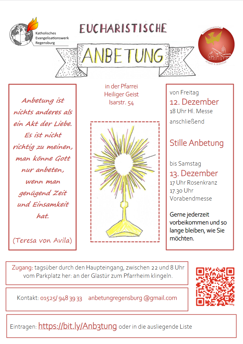 Herzliche Einladung zur 24h Anbetung in der Pfarrei Hl. Geist, Regensburg, am 12. Dezember, beginnend mit der hl. Messe (18 Uhr), bis Samstag, 13. Dezember, 17:30 Uhr Rosenkranz/18 Uhr hl. Messe.