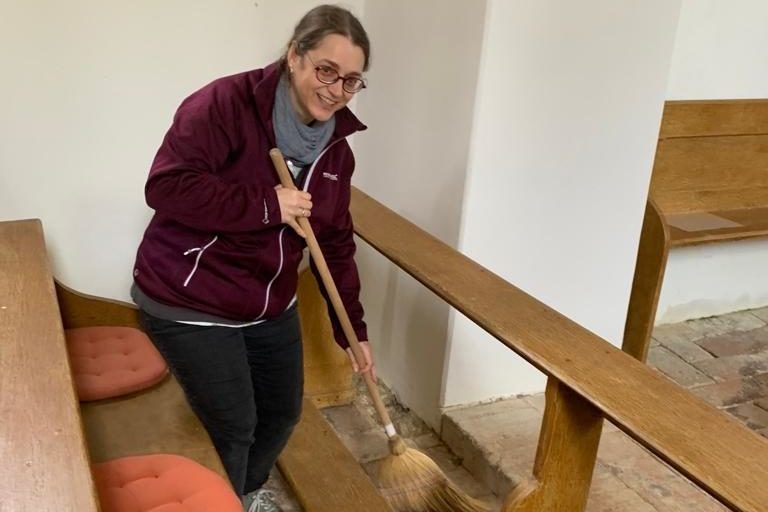 Der hl. Franziskus zeichnete sich durch eine außergewöhnliche Ehrfurcht vor jedem Gotteshaus aus. So geschah es, dass er auf seinen Reisen, wenn er in eine schmutzige Kirche kam, Hand anlegte und sie auszufegen begann. Daran erinnert ein Besen, der gleich am Eingang der Kapelle Aschach lehnt und zum Nachahmen einlädt. Unsere Beirätin und Diözesansprecherin Katrin Oppitz, stets tatkräftig und einsatzbereit, nahm ihn gleich in die Hand und legte los. Die Kapelle, die dem Hl. Wenzelslaus geweiht ist, gehört zum Hainsackerer Franziskusweg, auf den sich eine kleine Pilgergruppe aus unseren Reihen am Nachmittag des 1. Mai begeben hat. Lobpreis und Gebete, Impulse zu den einzelnen Stationen und der Sonnengesang, und natürlich ein gemeinsames Picknick machten die vier gemeinsamen Stunden sehr kurzweilig.