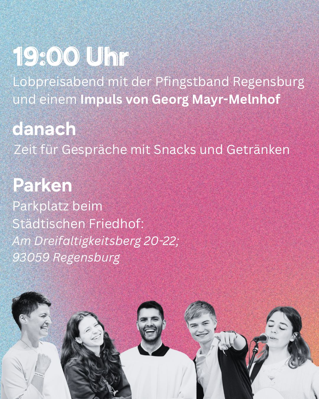 Bestimmt wird es ein starker Abend werden – ein kleiner Vorgeschmack zum großen Pfingstevent von 23. – 25. Mai in Regensburg bzw. in vielen deutschsprachigen Städten! Georg Mayr-Melnhof, der Gründer der Loretto Gemeinschaft (Salzburg) wird dazu eigens nach Regensburg kommen. ALLE, ob jung oder alt, ob skeptisch, atheistisch oder schon mit Jesus unterwegs, sind eingeladen!!! Hört dazu die Einladung des Hauptorganisators der Pfingsttreffen, der Jüngerschaftsschule Follow me und dieses Abends, Josef Irl, hier!