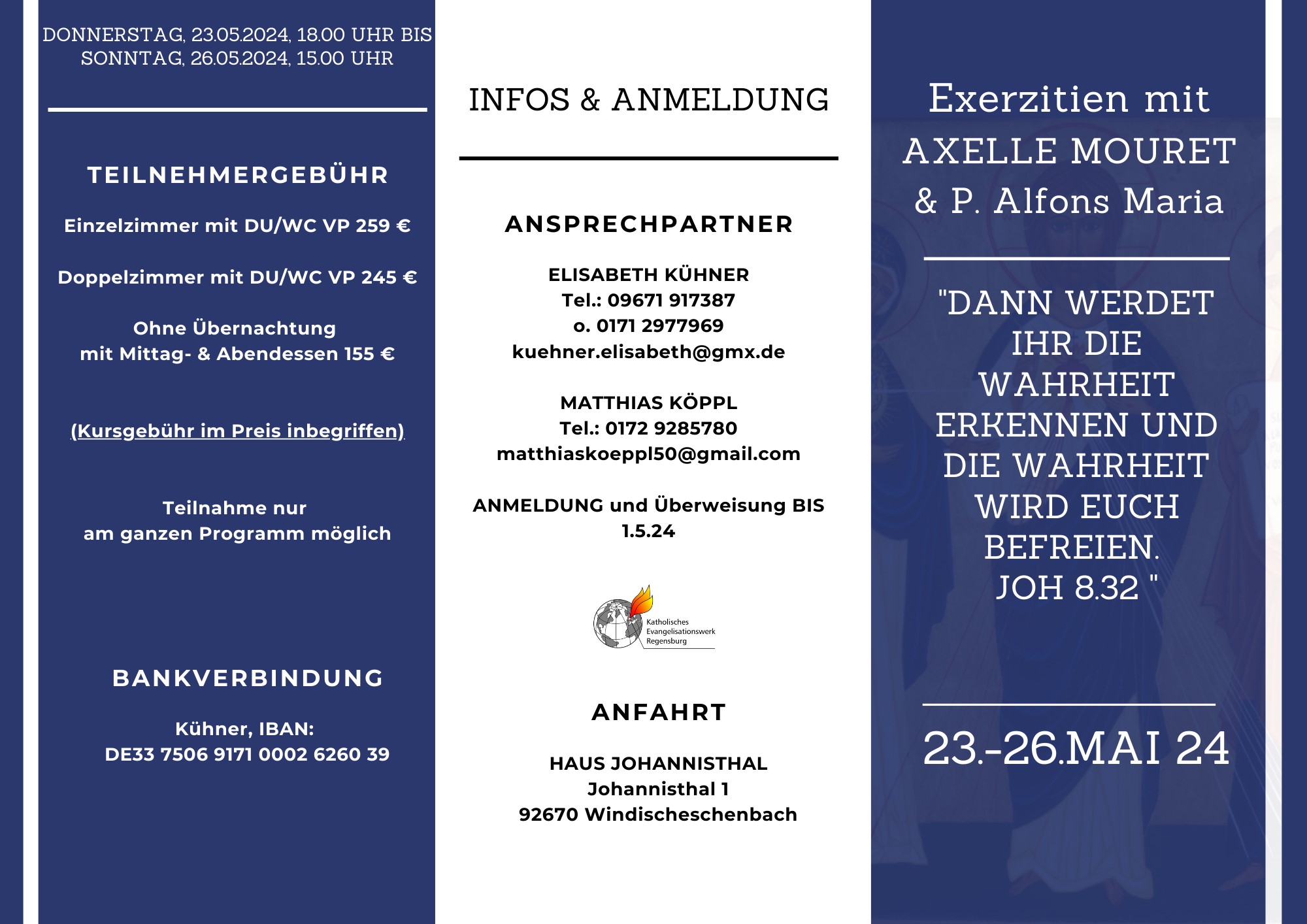 Home„Dann werdet ihr die Wahrheit erkennen…“ – Exerzitien mit Axelle Mouret im Haus Johannisthal Wann 1. Juni 2023 - 4. Juni 2023 18:00 - 15:00 Zum Kalender hinzufügen ICS herunterladen Google Kalender iCalendar Office 365 Outlook Live Wo Haus Johannisthal Johannisthal 1, Windischeschenbach, Bayern, 92670 Veranstaltungstyp Exerzitien Flyer vorne Flyer hinten