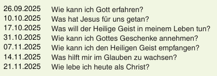 Für unser alltägliches Leben – mit all den Höhen und Tiefen – schenkt Gott uns seinen Heiligen Geist. An sieben Abenden möchten wir den zentralen Fragen unseres christlichen