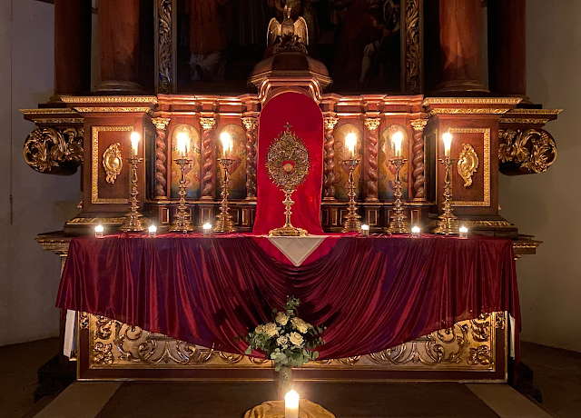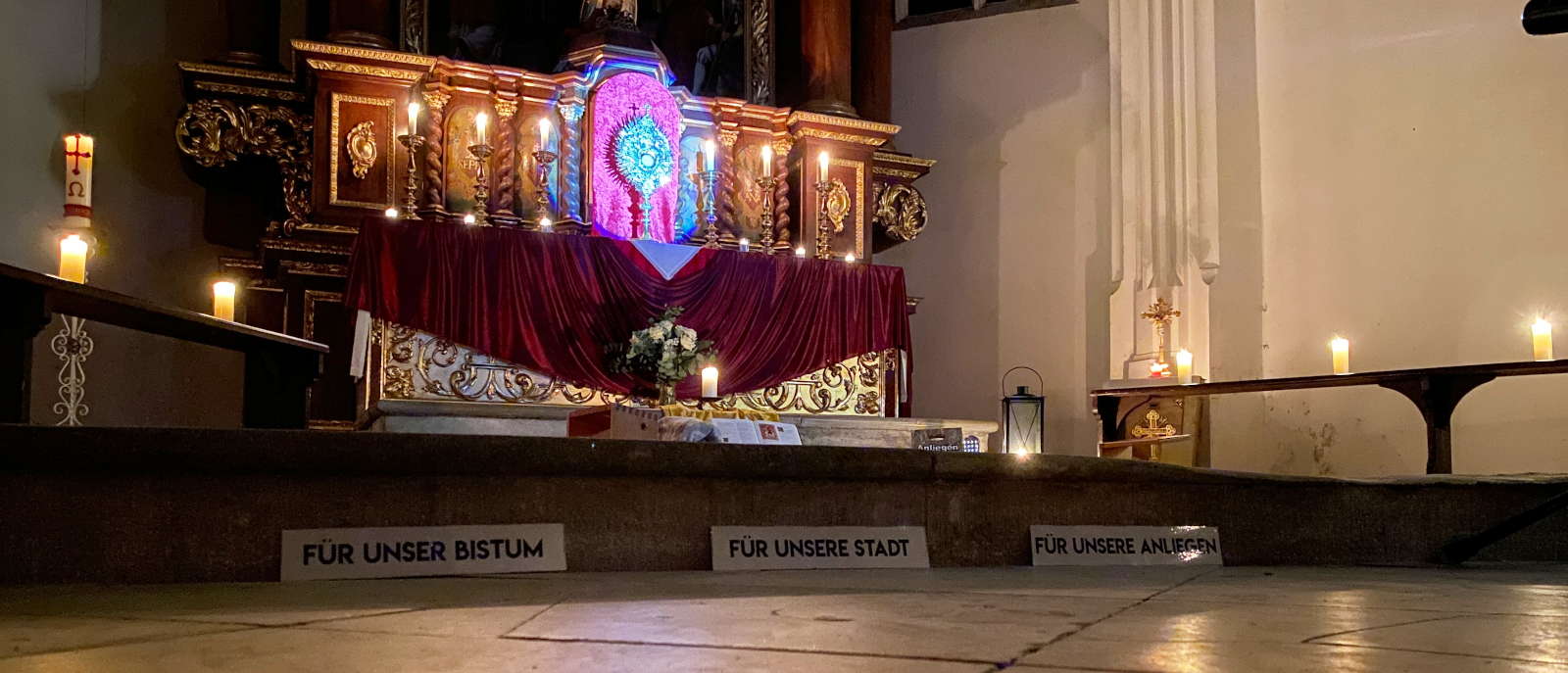 Als ich in meiner Gebetszeit vor dem Allerheiligsten kniete, fielen mir die kleinen Teelichter auf dem Hochaltar auf: Sie waren fast abgebrannt. Die ersten acht Stunden von 24/2 waren bereits vorüber. Ich dachte, die Zeit läuft unaufhaltsam dahin. Tage und Jahre vergehen. Unsere Lebenszeit verrinnt. Mir fielen auch die hohen Kerzen auf den Leuchtern auf: Ihre Flammen waren regungslos und schienen still zu stehen. Und vor mir in der Mitte des Altars: Jesus in der Monstranz. Bei Ihm steht die Zeit still. Bei Ihm in der Ewigkeit gibt es keine Zeit. Ich durfte wieder bei Ihm sein und mit den Augen die Ewigkeit berühren. Gerade auch die besondere Stille in dieser Nacht verstärkte in mir diesen Eindruck, dass hier die Zeit still steht.
